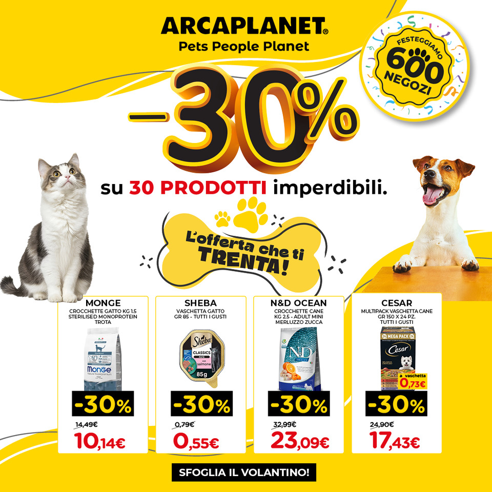 Arcaplanet è leader nel settore pet in Italia. I suoi punti vendita offrono una vasta scelta di prodotti; cibo, accessori e giochi, per soddisfare tutte le esigenze dei pet. Inoltre, la grande varietà di offerte e attività promozionali in continuo aggiornamento, garantiscono ai clienti risparmio e convenienza, nel massimo della qualità.